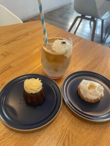 桃カヌレはしっとりとしていて、上にのっている桃風味のまろやかなフロスティングとカヌレの香ばしさが相性抜群です!レモンスコーンはサクサクなスコーンにレモンピールが入っていて爽やかさを感じるスコーンでした🍋
