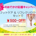 ★春のお出かけ応援キャンペーン★ フットケア&リフレクソロジーセットで 500円off!! ※リフレは足、手から肩、頭のどれでも可。 ※フットケアはネイルケアと変更可。(手のネイルケアも可) 期間限... -